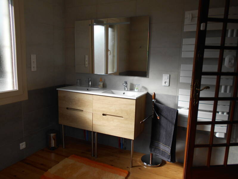- à l'étage (sol en parquet) 2 chambres : une chambre avec un lit 140X190, une chambre avec un lit 160x200, un WC séparé, une salle d'eau avec douche, terrasse privative.